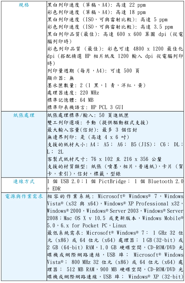 連線方式:USB 2.0;PictBridge;Bluetooth 2.0 +EDR